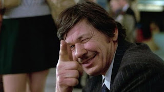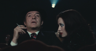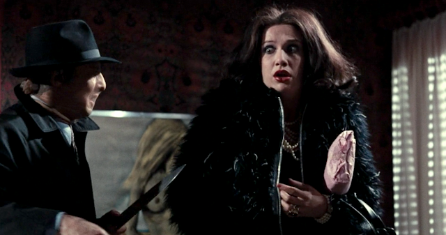 By 1973, though, it's a bit didactic to go into such well-churned territory, but this darkened zone--where a girl can feel objectified but still enjoy the sex and get enough of her rocks off--does leave space for Nicolodi to--as Nero and Redgrave did for Quiet Place in the Country--quietly fill up her character with traits and moments that divulge themselves--Farber termite-style--subtly, on repeat viewing. Watcg her face for example after the butcher instructs her to cry over the 'stolen' items from Total's first robbery, when Pierelli is there helping calculate the total for the insurance (he actually stole way more than Total did, and hid the booty in a suitcase in the basement). Facing close to the camera in close-up we see her crying increase and decrease based on Pirelli's proximity; when it starts to grate on the butcher's nerves, she stops abruptly and cuts into a vague smile, barely able to reign in her delight at the thought of getting more expensive and useless stuff.