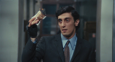 The plot hinges on the concept of identity theft as having the power to crash whole neural networks, as a neurotic bank teller Total (Flavio Bucci - the blind pianist in Suspiria) who becomes obsessed with stealing the signifiers of a rich, corrupt butcher's (Ugo Tognazzi) ID -his hat, knife, car, even mistress-- Total steals it all. Launching himself on an absurdist Harpo-cum-Karl Marxist freak-out, Total starts by quitting his bank teller job by daring to burn a lire note in his boss's office ("that's sacrilege!" the boss exclaims). Total justifies his crazy crime spree by not stealing any cash: "I'm a Mandrakian Marxist," he says "I only steal what I need." Daria Nicolodi is Anita, the butcher's mistress, who at first welcomes Total as a sexually intriguing diversion, then pins hope as a possible escape aid, but she's too smart to believe there's anywhere to run that wouldn't just be here. Salvo Randone plays Total's shell-shocked dad, who's in total denial of his son's proclivities (by refusing to believe his son's a thief, he's able to enjoy the caviar guilt-free).